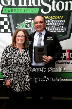 The Canadian Vintage Modifieds held their annual banquet at the Hamilton Air Force Association in Dundas on Saturday November 8. Among the many awards were banners for all of the top drivers, most wins, rookie, hard luck, most improved driver and the president's award. The top 5 drivers this season were TJ Marshall, Ricky Willigar, Ty Riopelle, Rodney Rutherford and Mike Podd. Ron Easton and Chuck Barton were inducted into the Canadian Vintage Modified Hall of Fame. For more info, please see Canadian Vintage Modifieds .