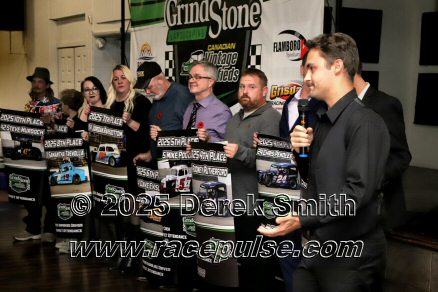 The Canadian Vintage Modifieds held their annual banquet at the Hamilton Air Force Association in Dundas on Saturday November 8. Among the many awards were banners for all of the top drivers, most wins, rookie, hard luck, most improved driver and the president's award. The top 5 drivers this season were TJ Marshall, Ricky Willigar, Ty Riopelle, Rodney Rutherford and Mike Podd. Ron Easton and Chuck Barton were inducted into the Canadian Vintage Modified Hall of Fame. For more info, please see Canadian Vintage Modifieds .