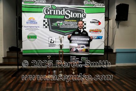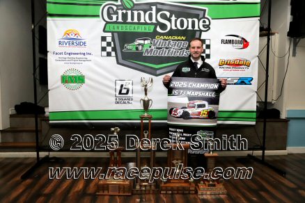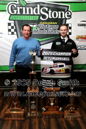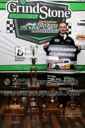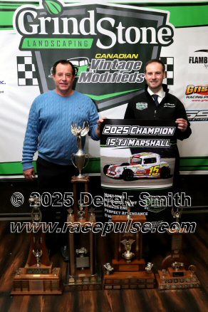 The Canadian Vintage Modifieds held their annual banquet at the Hamilton Air Force Association in Dundas on Saturday November 8. Among the many awards were banners for all of the top drivers, most wins, rookie, hard luck, most improved driver and the president's award. The top 5 drivers this season were TJ Marshall, Ricky Willigar, Ty Riopelle, Rodney Rutherford and Mike Podd. Ron Easton and Chuck Barton were inducted into the Canadian Vintage Modified Hall of Fame. For more info, please see Canadian Vintage Modifieds .