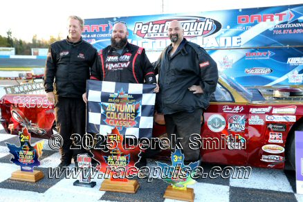Peterborough Speedway held their annual Autumn Colours Weekend from Friday October 10 through Sunday October 12. Today started with a 167 lap race for the Pro Late Models, followed by some postponed qualifying, and features for Super Stocks, Mini Stocks, Legends, Bone Stocks, OSCAAR Modifieds and OSCAAR Hot Rods. Jake Sheridan won the Pro Late Model feature, followed by Rick Spencer-Walt, Dale Shaw, Dustin Mombourquette and Dan McHattie. Phil Givens won the Bone Stock feature, with Jo Lawrence a very close 2nd and Jordan Wilmms 3rd. Tyler Hawn won the OSCAAR Hot Rod feature, followed by Mark Gordon and Luke Gignac. Doug Butler won the Mini Stock feature, with James Townsend 2nd and Jacob Sutcliffe 3rd. Amand Balson finished first in the OSCAAR Mofifed feature, but was DQ'd in tech. Max Beyore finished next, with TJ Edwards and Jason Keen following. The top 3 in the Legends feature were Mitch Wright, Parker Travis and Adam Cuthbertson. Shawn Chenoweth won the Super Stock feature, followed by Daniel Hawn and Marlie Owen. For full official results and more info, please see Peterborough Speedway and OSCAAR with APC Series .