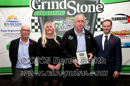 The Canadian Vintage Modifieds held their annual banquet at the Hamilton Air Force Association in Dundas on Saturday November 8. Among the many awards were banners for all of the top drivers, most wins, rookie, hard luck, most improved driver and the president's award. The top 5 drivers this season were TJ Marshall, Ricky Willigar, Ty Riopelle, Rodney Rutherford and Mike Podd. Ron Easton and Chuck Barton were inducted into the Canadian Vintage Modified Hall of Fame. For more info, please see Canadian Vintage Modifieds .
