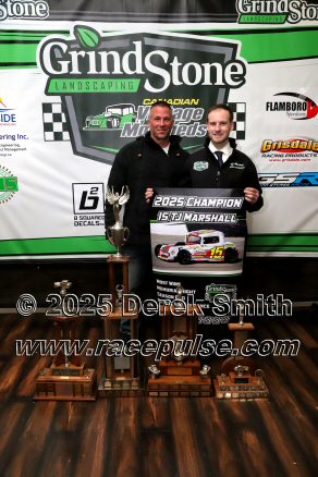 The Canadian Vintage Modifieds held their annual banquet at the Hamilton Air Force Association in Dundas on Saturday November 8. Among the many awards were banners for all of the top drivers, most wins, rookie, hard luck, most improved driver and the president's award. The top 5 drivers this season were TJ Marshall, Ricky Willigar, Ty Riopelle, Rodney Rutherford and Mike Podd. Ron Easton and Chuck Barton were inducted into the Canadian Vintage Modified Hall of Fame. For more info, please see Canadian Vintage Modifieds .